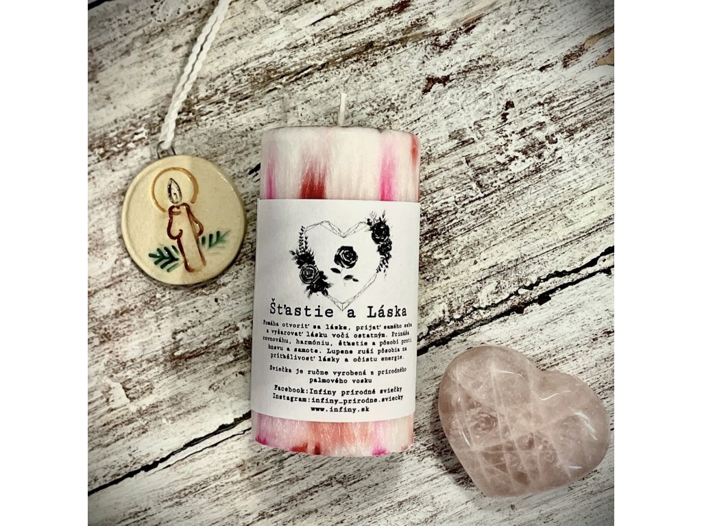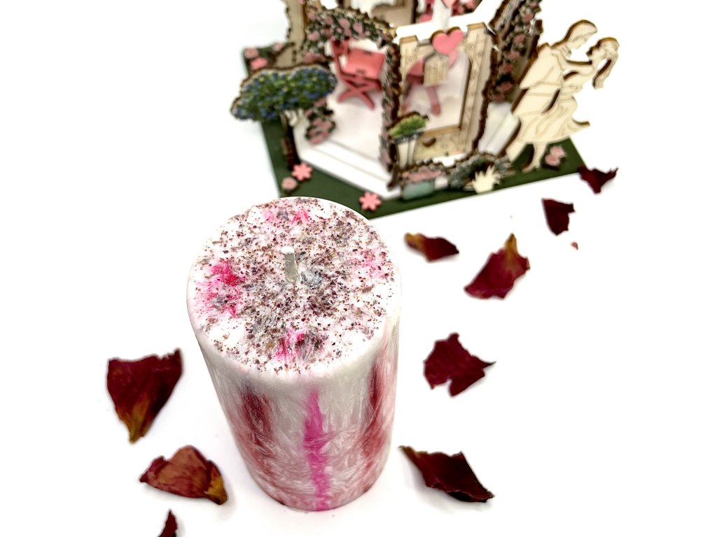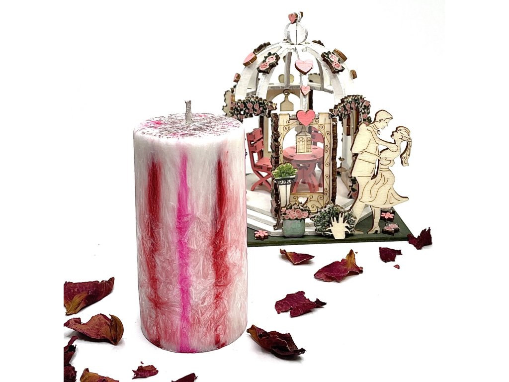 Sviečka je ručne vyrobená na Slovensku z prírodného palmového vosku. Palmový vosk je 100% prírodný obnoviteľný zdroj určený na výrobu sviečok a má výraznú kryštalickú kresbu. Sviečka je zafarbená kvalitnou prírodnou farbou určenou do sviečok. Sviečka má bavlnený splietaný knôt určený do palmového vosku. Táto sviečka nie je vonná sviečka, neobsahuje žiadnu vôňu. Sviečka obsahuje kúsky Ruže.